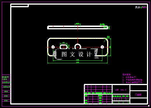 此门锁板零件,通过测绘实物,获得零件图,并结合图纸形状,分析冲压工艺,基本工序有落料,拉深,冲孔。工件的外形成盒形结构,通过详细计算展开尺寸,获得毛坯尺寸,绘制图纸,并设计排样图,计算模具的各个尺寸,绘制模具装配图和零件图,记录计算结果,校核压力机的型号。