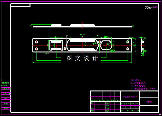 此零件,是门锁板上的一个配件,工件成长方形,内部有孔,而且还带有弯曲,孔还是不规则的,结合零件形状和尺寸分析,设计排样图,计算模具的外形尺寸,选择钢板模架,选择滑动导柱导套,计算模具的刃口尺寸,绘制倒装结构的模具零件图和装配图,计算压力大小,选择合适的压力机。