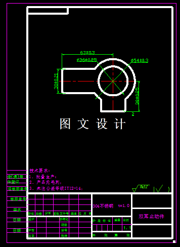 此零件为双耳止动件,两耳成90°,所选材料为不锈钢,结合材料的性能,以及孔边距离,选择落料冲孔复合模,并设计倒装结构,计算出凹模的外形尺寸,刃口尺寸,冲压力的大小,然后根据尺寸绘制模具图纸和零件图。