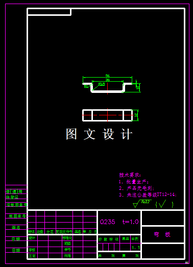 此零件属于四角弯曲零件,零件基本工序有落料,弯曲,而且零件的外形规则,为了提高材料利用率,利用切断的工艺,将原材料板材设计成宽度需要的尺寸,直接利用切断弯曲的工艺,设计复合模,计算展开尺寸,设计定位装置,并绘制模具结构和零件图。