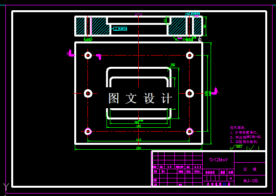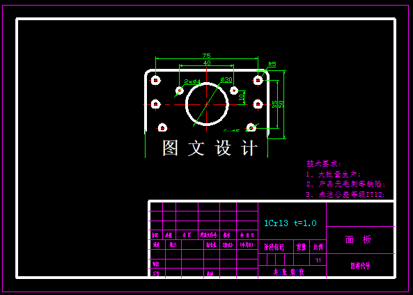 此面板零件,是个平板,外形是矩形,四角圆弧过渡,内部有多个圆孔,而且不对称分布,通过排样设计,计算出材料利用率,然后计算模具的外形尺寸和刃口尺寸,绘制模具图纸,计算出冲压力的大小,选择合适的压力机并校核参数。