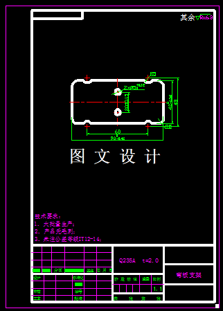此架板零件,外形由圆弧过渡,形状对称,中间有两个圆孔,对称分布,平板结构件基本工序有落料和冲孔,通过尺寸分析,满足复合模的要求,因此选择倒装结构的复合模,计算模具外形尺寸和刃口尺寸,绘制模具结构图和零件图。