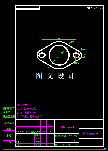 此排气管垫片零件,是用于排气管上的一个零件,垫片是个平板,形状比较容易理解,基本工序有落料和冲孔,结合冲压工艺,选择常见的倒装冲压复合模结构,合理设计排样结构后,利用公式计算出模具的外形和刃口尺寸,并绘制模具结构图和零件图。