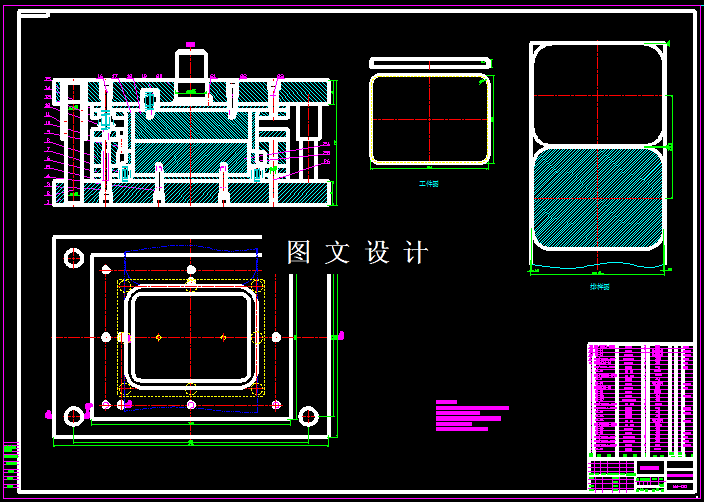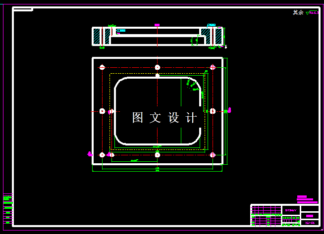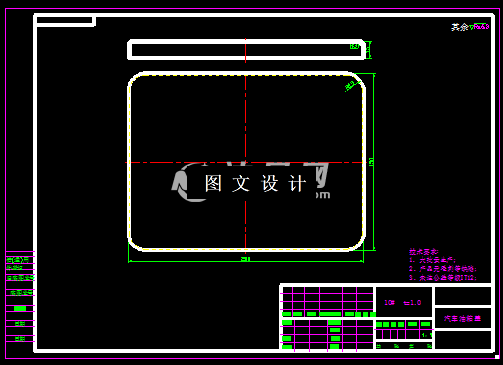 此零件名为汽车油箱盖,零件是矩形结构,形状简单,四角圆弧过渡,数据盒形拉深件,利用公式,计算出工件的展开图,然后合理设计排样结构,计算模具各个尺寸,利用二维三维软件,绘制模具图纸。