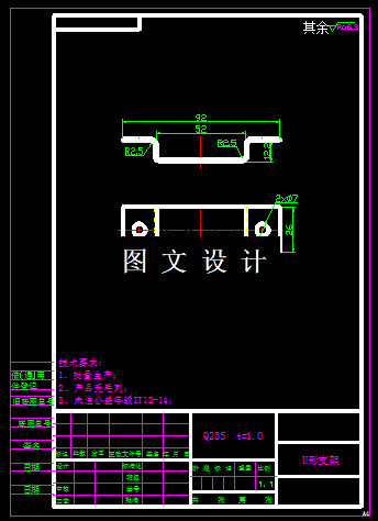 此零件是个U形结构零件,而且属于四角弯曲,弯曲的部位比较多,通过查阅资料,计算出工件的展开尺寸,通过外形的定位,单独设计弯曲模具,结构采用正装,凹模设计在下模,选择标准模架设计,并计算冲压力,模具各个尺寸,绘制模具零件图。