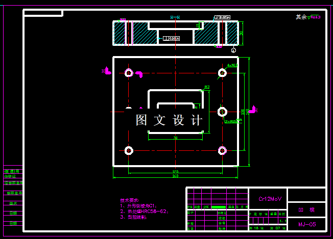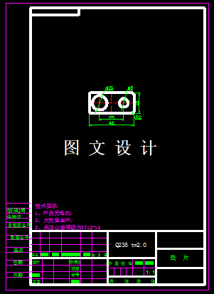 此是个平板零件,外形是长方形规则结构,内部有两个圆孔,直径不等,分步也不对称,但是孔边距离满足复合模的条件,因此可以选择复合模的生产方式,结合图形尺寸,计算模具的尺寸,并设计模具结构,绘制模具图纸。