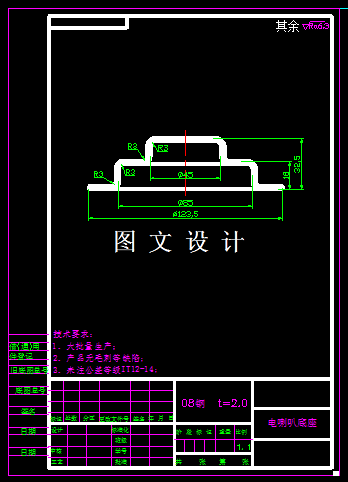 此零件为电喇叭底座,零件的形状简单,是个台阶的拉深件,基本工序有落料和拉深,只是这台阶的拉深,需要两次拉深才能实现,通过计算和分析,确定两次拉深的工序尺寸和图纸,再计算工件的展开毛坯,结合首次拉深,设计落料拉深复合模,再单独进行二次拉深,因此要设计两套模具,绘制两套模具的图纸。