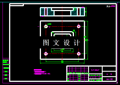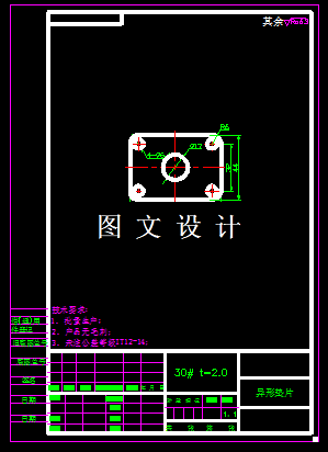 此异形垫片,是个平板,外形成矩形,内部圆孔对称分布,基本工序有落料和冲孔,因此通过合理排样,绘制排样图,设计模具结构图,并结合图形,计算模具刃口和外形尺寸,绘制模具零件图。