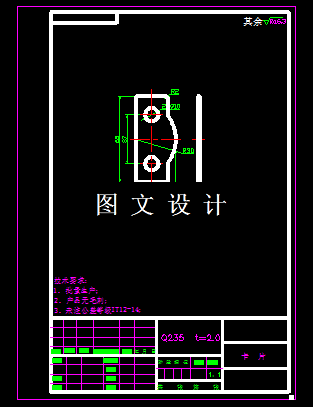 此卡片零件,外形由直线和圆弧过渡,内部有两个圆孔,对称分布,孔边距离满足复合模的要求,因此设计倒装结构的复合模,并详细计算模具的外形尺寸和刃口尺寸,绘制模具结构图和零件图。