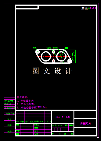 此调整垫片,外形类似平行四边形,内部有圆孔,基本工序有落料,冲孔,通过尺寸分析,该零件满足复合模的设计要求,因此选择倒装结构的复合模,并计算模具的外形尺寸,刃口尺寸,选择标准模架,绘制模具结构图及零件图。