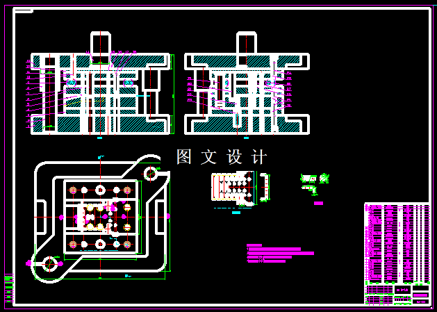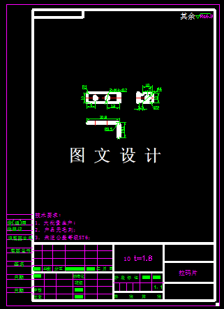 此拉码片,是个L形结构零件,尺寸比较小,基本工序有落料,冲孔,弯曲,结合工艺分析,选择冲压级进模,而且设计双排结构,将工件排成U形结构,最后中间切开就成了两个零件,设计排样图,结合图形,计算模具刃口尺寸外形尺寸,绘制模具结构图,选择标准模架,绘制零件图。