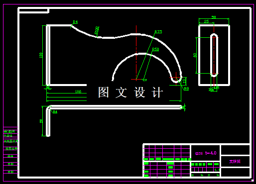 此支撑架,形状简单,L形,圆弧过渡成型,板材厚度为4.0mm,因此设计冲压模具时,必须要对称分布设计,才能保证工件的尺寸和模具寿命,最后将工件连着的载体切断,工件分离,一出二,提高生产效率,详细计算展开,排样尺寸,计算模具外形和刃口尺寸,绘制模具结构图和三维图,零件图。