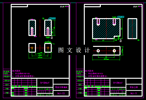此减速器垫片,是个弯曲零件,形状简单,工艺分析后确定设计成级进模,利用中间的平板部分作为连接载体,设计排样图,然后计算模具尺寸,设计正装结构装配图,弯曲主体向上,计算刃口尺寸,绘制模具零件图。