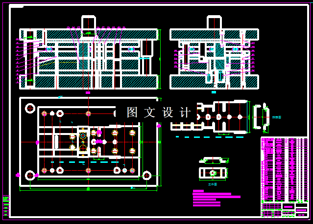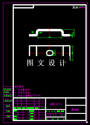 本次设计的固定架,是个四角弯曲零件,图形简单,为了满足生产量,采用级进模设计,将零件的基本工序分解后,合理的连接,设计排样图,并绘制模具结构图和三维图,零件图,记录模具外形,刃口尺寸计算过程,计算压力大小,选择合适的压力机。