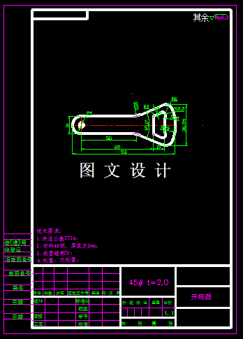 此零件为生活中常见的开瓶器,选择的材料为45号钢,厚度为2.0mm,比较常见而且实用,零件实用量比较大,因此选择模具生产最划算,根据尺寸分析选择倒装结构的复合模,合理排样后计算模具刃口和外形尺寸,绘制模具结构图和零件图。