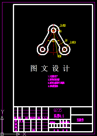 此零件为单号连接件,零件的形状比较复杂,有直边和圆弧过渡而成,零件内部有圆孔,通过排样分布比较,选择利用率最高的方案,并设计其倒装结构的冲裁模,计算模具的外形和刃口尺寸,绘制模具结构图零件图等。