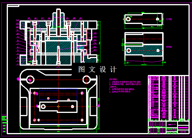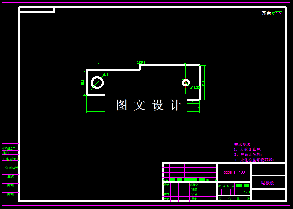 此零件是电极板,是个平板,基本工序有落料,冲孔,通过分析尺寸,确定可以采用复合模,因此设计其倒装结构的复合模具,计算出合适的排样尺寸,绘制排样图,选择标准模架,绘制模具结构图,3D图和零件图,