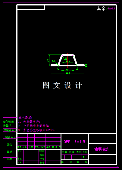 本次设计的是轴承端盖这个零件,此零件是个锥形的拉深件,外形尺寸不大,因此利用冲压模具可以实现,通过计算工件的展开毛坯和拉深系数,确定可以一次成型,因此设计该模具的二维图和三维图,并记录详细的计算过程。