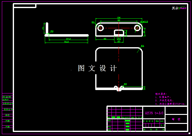 本次设计针对L形板,进行冲压工艺分析和判断,其基本工序有落料,冲孔,弯曲,本次设计主要是针对其中的落料和冲孔工序,进行模具设计,先计算工件的展开尺寸并绘制展开图,然后计算模具尺寸,绘制模具结构图和零件图。