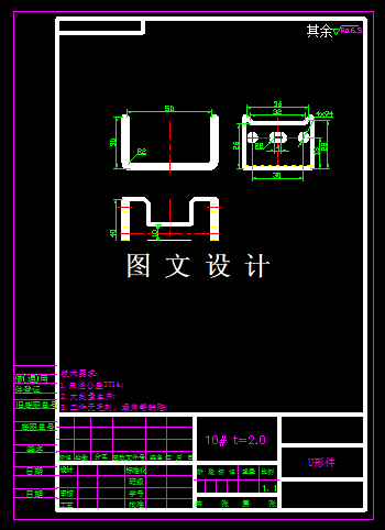 本次设计的零件,整体成U形结构,本次设计就是针对这样的U形弯曲零件,设计其弯曲模具,计算模具的外形尺寸和刃口尺寸,并选择合适的模架,选择合适的压力机,绘制模具结构图及零件图。