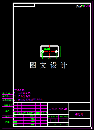 该云母片零件,形状结构简单,外形是矩形,内部两个圆孔,两侧对称分布,通过合理的排样结构,设计其冲压模具,该模具结构简单,计算容易,详细计算后,选择合适的标准模架,设计其模具结构图。