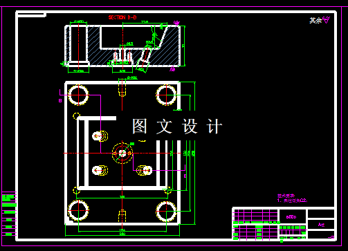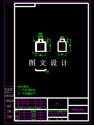 该零件为盒形零件,盒形是长方形,壁厚均匀,端头部分是圆形,且有外螺纹,对于外螺纹这样的零件,为了保证螺纹的合模吻合,因此设计哈夫结构,将螺纹部分分两半合模后,在注塑成型,结合这样的分析后,选择一模两腔结构,对称分布,并绘制两板模结构图。