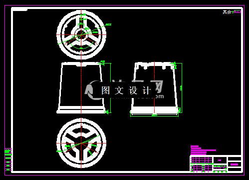 此端盖,是个圆形盖类零件,工件形状是圆形,壁厚均匀,因此内部设计加强筋,120°分布,端口处有内螺纹,因此设计模具时,为了减少难度,选择手工脱模方式,将浇口设计在工件的底面,因此选择一模一腔三板模,绘制其模具结构图。