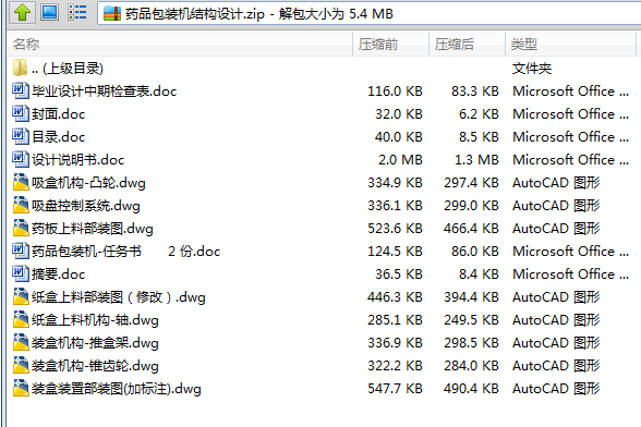 本设计的主要设计内容为药品装盒机的上料装置设计、药板装盒装置设计。完成的主要工作有:综述了药品装盒机的发展历程,发展现状及发展战略;确定了总体方案、包装工艺,物料的运动方式采用垂直与水平相结合的方式,从而缩短了机器的尺寸;设计了纸盒上料机构,利用负压吸盘对纸盒进行分离、输送,吸盘由凸轮机构驱动,上下移动;设计了药板上料机构,通过槽轮机构驱动齿形带对药板进行定量输送;设计了装盒机构,将药板、说明书装入纸盒内,同时完成纸盒的折叠封合。