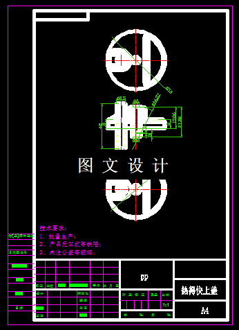 此零件是家用常见的热得快的上面盖子,外形是圆形,形状复杂,因此选择注塑工艺最合理,且是绝缘体。结合工件形状分析,选择合适的材料分析,选择合适的模具结构,设计一模两腔,两板模结构,绘制模具三维图和二维图。