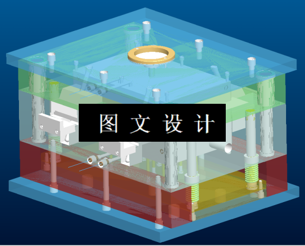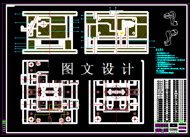 本次设计的零件为锁扣,零件尺寸比较小,但是形状不规则,侧面有缺口,需要设计抽芯机构,结合尺寸,选择一模四腔,对称分布,四处设计抽芯,计算模具尺寸,选择龙记模架,利用三维软件绘制模具图纸,并转成2D工程图。