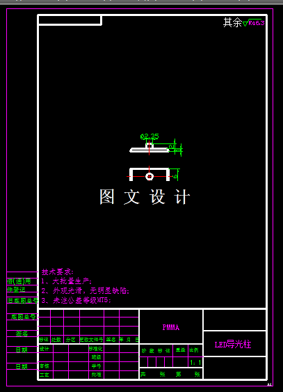 本次设计的零件是导光柱,该零件外形尺寸很小,形状也简单,无需设计抽芯机构,工件有斜度,方便脱模,因此直接设计两板模,由于尺寸小,因此设计一模四腔,提高生产效率,详细计算模具尺寸后绘制模具图纸。