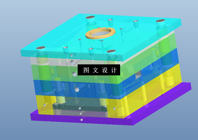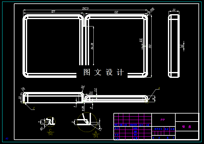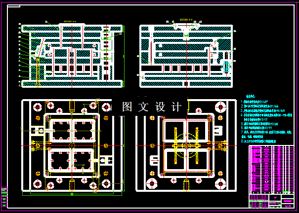 本次设计的是塑料餐盒,带盒盖的那种,零件比较简单,合盖的位置有内卡扣,因此这里需要设计抽芯机构,结合工件形状和尺寸,详细计算后选择一模两腔,绘制模具图纸。