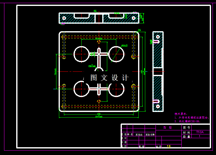 本次设计的扣盖零件,是个很小的零件,形状也简单,因此需要设计一模多腔,本次设计选择一模四腔结构,对称分布,选择脱模板顶出工件。因此选择标准龙记模架,详细计算模具尺寸,绘制图纸。