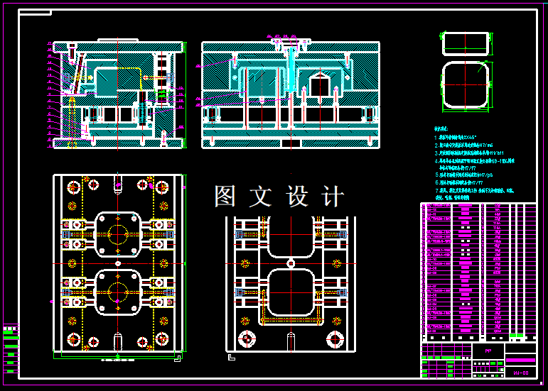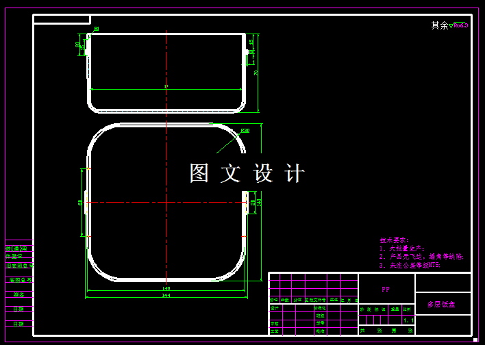 本次设计针对常用的多层餐盒零件,设计该零件的注塑模。由于零件的形状规则,是个盒形,两侧带有加强筋,因此这两部分不能强制脱模,需要设计抽芯机构,选择一模两腔结构,利用三维软件,设计模具图纸。