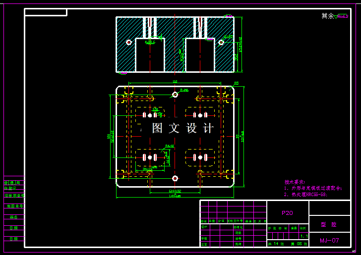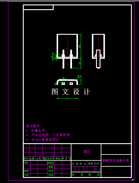 从图形分析,此零件,注塑时,插件是与塑料一起成型的,成整体结构,因此设计模具时,先固定中间的插件,再进行进料冷却,工件尺寸比较小,选择一模四件,两板模结构,详细计算后绘制模具图纸。