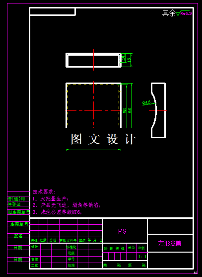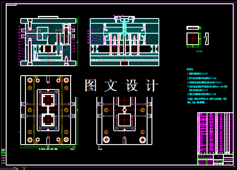 该零件比较简单,是一个矩形盒形件,通过对零件尺寸和形状的分析,选择一模两腔,两板模结构,选择侧浇口,顶杆顶在工件的内侧,选择标准模架,绘制出合理的模架图纸,包括二维图,三维图,非标零件图。