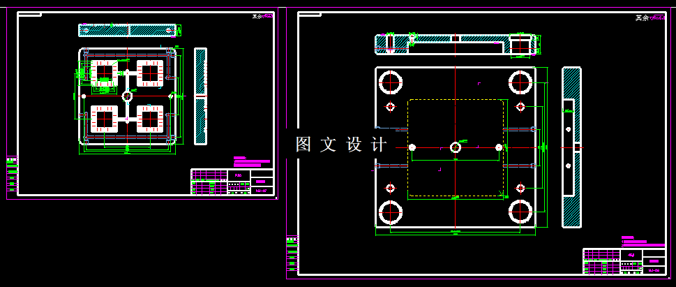 本次所设计的垫块,形状规则,外形时矩形,中间同样也是矩形,环形形状的内部,还有圆孔,对称分布,因此零件相对比较简单,不需要设计抽芯机构,因此选择两板模,侧浇口,一模四腔,计算后选择标准模架,绘制模具图。
