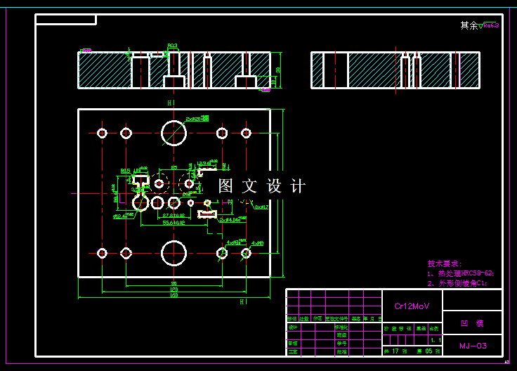 此零件为汽车电机上的接头,零件形状复杂,多处弯曲,零件尺寸很小,因此建议采用级进模设计,但是零件复杂,全部工序在级进模里,无法实现,因此分开考虑,利用级进模进行到平板冲裁后,再单独设计弯曲模,本次设计主要设计在弯曲之前的所有工序的级进模。绘制模具图纸及零件图。