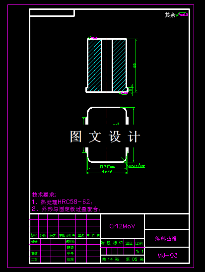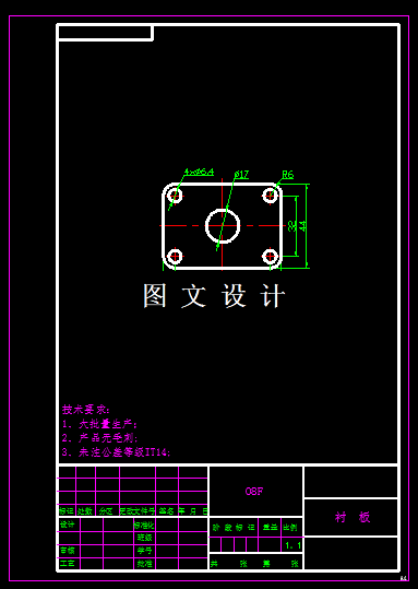 该衬板零件,外形规则矩形,四角圆弧过渡,中间有个圆孔,四个小圆四角对称分布,因此整个形状是对称零件,基本工序只有落料和冲孔,因此可以设计倒装复合模或者冲孔落料级进模,结合生产需求,本次设计冲孔落料级进模,通过计算模具刃口及外形尺寸后,绘制模具结构图及重要零件图。