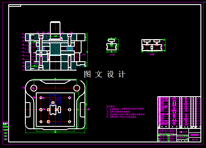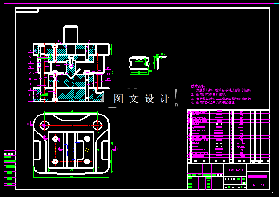 该后盖板零件,是个多角弯曲零件,且弯曲的方向和方式不同,有U形和V形弯曲,展开后的零件形状也不规则,因此计算排样图,刃口和模具外形计算后,绘制倒装落料冲孔复合模。再设计V形弯曲和U形弯曲模,注意要避免零件与模具之间有干涉,绘制弯曲模结构图。