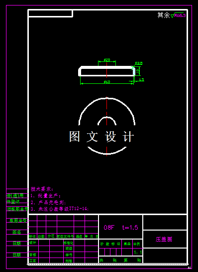 本次设计的压盖圈零件,外形类似盖子,中间有个圆孔,外形是标准圆形的拉深形状,尺寸适中,基本工序比较多,通过计算尺寸分析,可以设计其多工序的复合模具,因此本次设计其正装结构的三工序复合模,绘制标准模具图纸。
