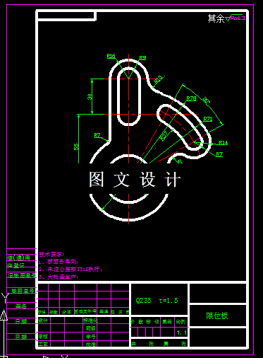 本次设计的零件叫限位板,零件外形不规则,内部有圆孔和月牙孔,不规则分布,因此设计排样图时,采用错开的方法,才能提高生产效率。然后计算冲压力大小,选择合适的压力机,计算模具尺寸,绘制模具图纸。