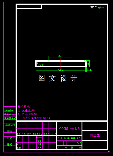本次设计的零件,工件形状比较简单,但基本工序比较多,有落料,拉深,冲孔,结合工件形状和尺寸,计算展开尺寸和拉深系数,确定设计三工序复合模具,结合计算结果,绘制模具装配图和零件图。