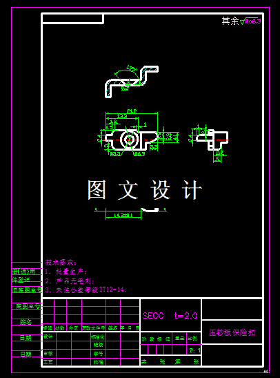 本次产品所用的材料为SECC钢,此材料为电解亚铅镀锌钢板,是一种冲压材料,工件形状复杂,多角弯曲,因此一次弯曲工艺无法实现,本次设计主要是针对第二次弯曲,进行冲压模具设计。