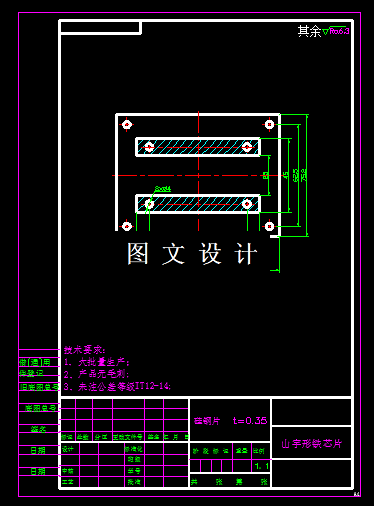 从图纸要求看,一共要生产出三个零件,其中两个零件是一样的,但是要在同一套模具里实现这三个零件,结合图形分析和计算,设计一套正装复合模,内部设计单独的凸凹模,同时生产多个零件。