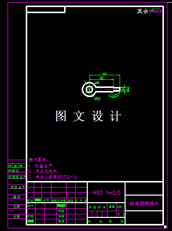 所设计的零件为继电器接线片,材料为H62,厚度0.5mm,中间有一个圆孔,外形尺寸比较小,利用错开排样法,提高材料利用率,利用三维软件计算后绘制模具结构图及模具零件图。