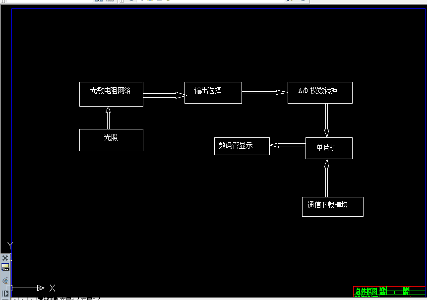 该数字式光照强度检测仪以单片机和模数转换为技术核心,具体由单片机最小系统、下载通信模块、A/D模数转换模块、光照方向检测模块、输出选择模块和数码管显示模块组成。在本系统的设计中,利用光敏电阻阻值随光强的变化特性来检测光强,采用单片机控制输出选择模块和数模转换芯片依次测量不同方向的光照强度,并通过编程处理数据进行光强的比较,最后通过数码管显示检测结果。