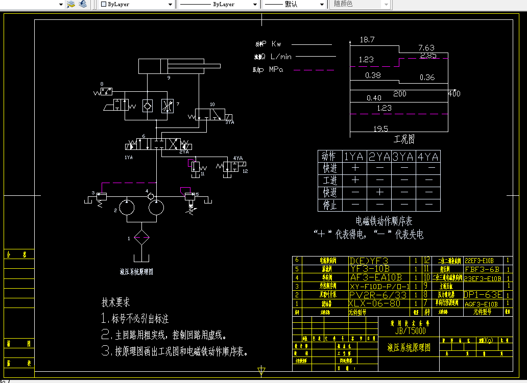 钻镗系统的工作循环时快进→工进→快退→停止。液压系统的主要参数与性能要求如下:最大切削力12000N,移动部件总重量25000N;快进行程200mm,工进行程200mm;快进、快退的速度为5m/min,工进速度应在(20~80)mm/min范围内无级调速;启动换向时间△t=0.05s,采用水平放置的导轨,静摩擦系数fs=0.2;动摩擦系数fd=0.1。机械效率取0.9。