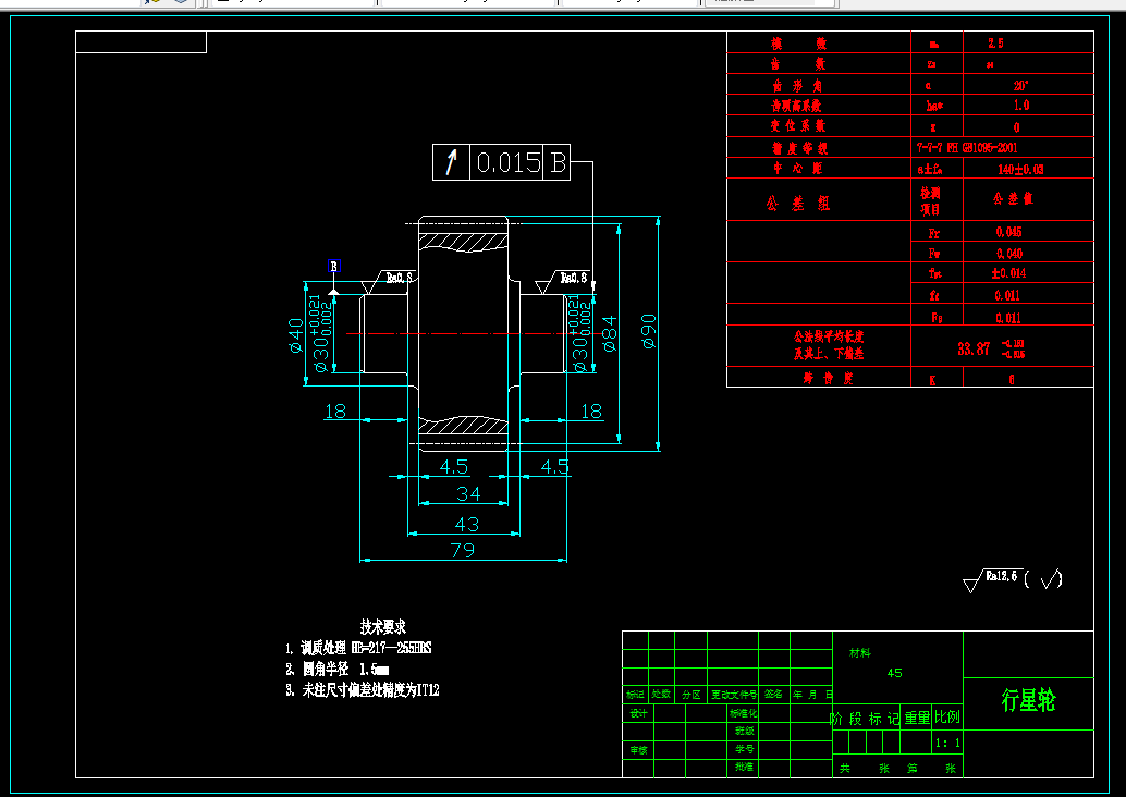行星齿轮传动机构的传动原理:当高速轴由电机驱动,带动太阳轮,然后带动行星轮转动,内齿圈固定,然后带动行星架输出运动的,在行星架上的行星轮既自转和公转,具有相同的结构。二级,三级或多级传输。行星齿轮传动机构主要由太阳齿轮,行星齿轮,内齿圈,行星架,命名为基本成分后,也被称为zk-h型行星齿轮传动机构。本设计是基于行星齿轮结构设计的特点,。行星齿轮和各种类型的特性的比较,确定方案;其次根据输入功率,相应的输出转速,传动比的传动设计、总体结构设计;