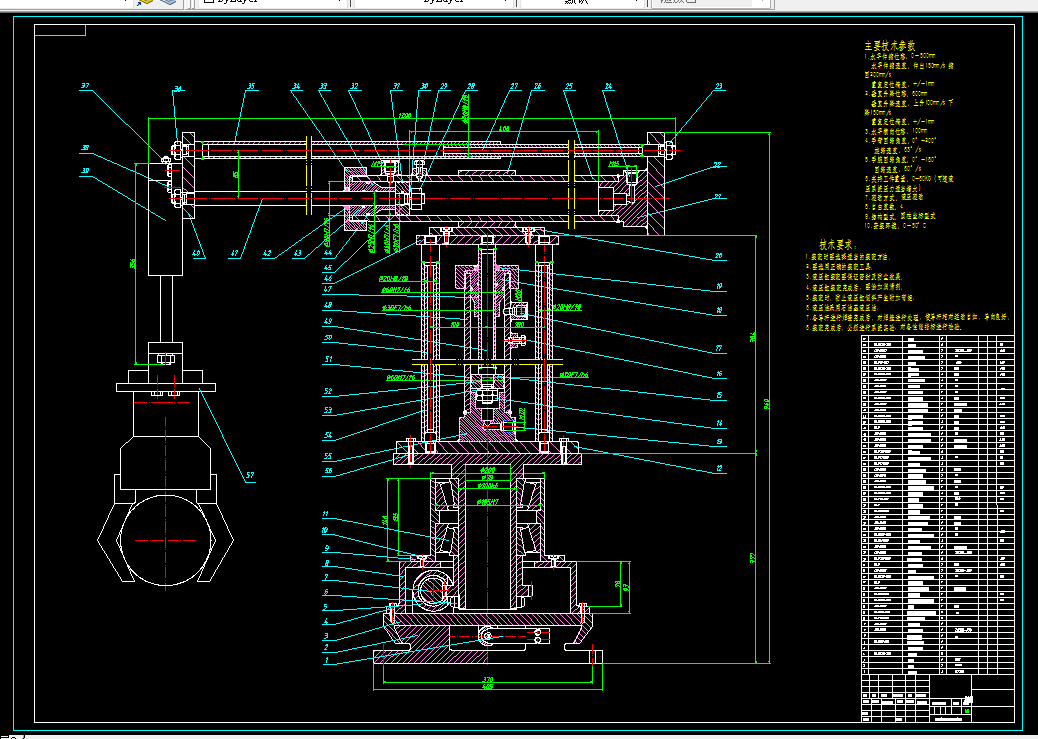 本次设计的四自由度液压搬运机械手根据规定的动作顺序,综合运用所学的基本理论、基本知识和相关的机械设计专业知识,完成对机械手的设计,并绘制必要装配图、液压系统图。机械手的机械结构采用油缸、螺杆、导向筒等机械器件组成;在液压传动机构中,机械手的手臂伸缩采用伸缩油缸,手腕回转采用回转油缸,立柱的转动采用齿条油缸,机械手的升降采用升降油缸,立柱的横移采用横向移动油缸;通过控制电磁阀的开关来控制机械手进行相应的动作循环,当按下连续停止按钮后,机械手在完成一个动作循环后停止运动。